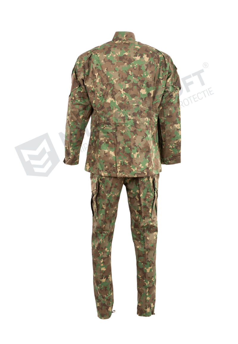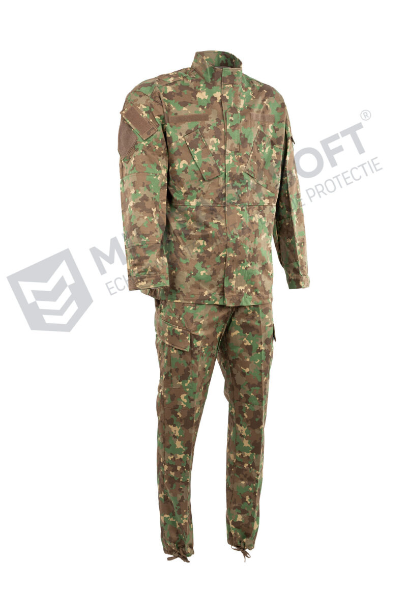 Produsul este confectionat din tesatura ripstop imprimat in culori mozaic pentru forte terestre, forte aeriene, forte navale , compozitie fibroasa amestec 50%nylon+50%cotton, greutate specifica de circa 220 gr/m2. Materialul de confectie este o tesatura ranforsata, are rezistente foarte ridicate la rupere si sfasiere. Materialul are comportare forta buna in purtare, rezistenta foarte mare la abraziune.