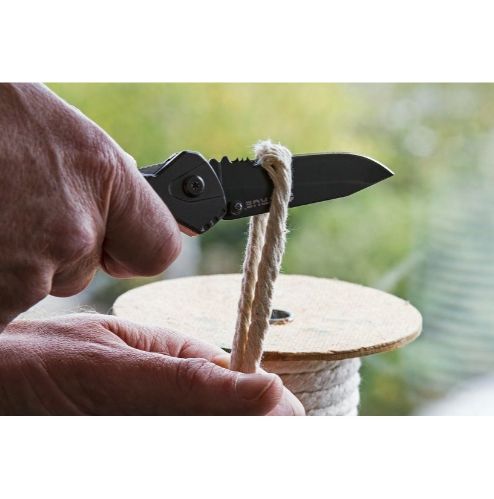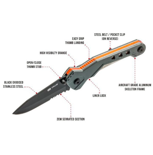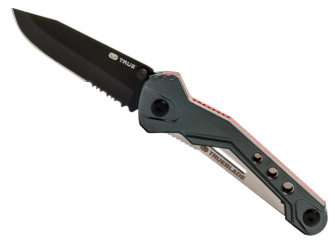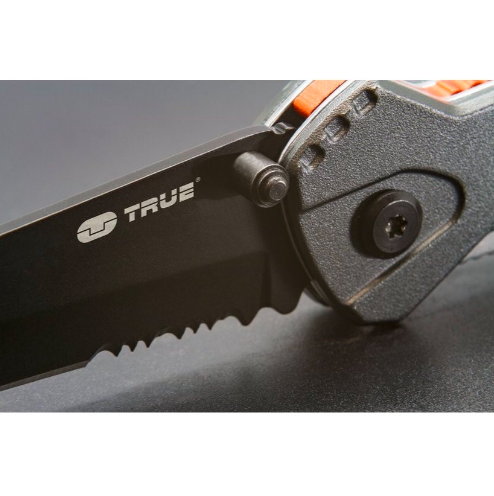 TRUEBLADE este un briceag cu lama de 6 cm partial zimtata care este partenerul ideal pentru orice sarcina, produs de compania True Brands Ltd. in Poole, Marea Britanie. Acest briceag dispune de o clema integrata din otel tip “pocket clip” pe partea din spate prin care poate fi atasat la curea sau rucsac, o scobitura pe maner pentru degetul mare pentru o aderenta suplimentara si un buton integrat pentru degetul mare care ajuta la deschiderea cu o singura mana. Trueblade dispune, de asemenea, de un liner lock, un mecanism de blocare cu arc incorporat care mentine lama intinsa si in siguranta atunci cand este utilizata, detalii portocalii stralucitoare care fac cutitul usor si rapid de gasit atunci cand aveti nevoie de el.