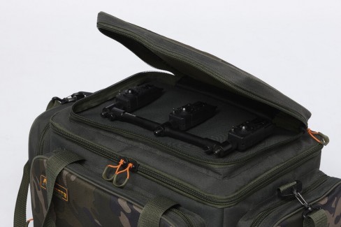 Compartimentul central este incapator si permite depozitarea echipamentelor necesare pentru o partida de pescuit, de asemenea, in partea superioara a gentii regasim un buzunar special conceput pentru a depozita in siguranta avertizorii gata echipati. Toate buzunarele sunt dotate cu fermoare calitative si rezistente la manipularile repetate.
