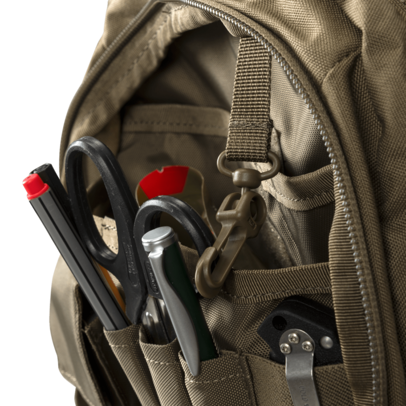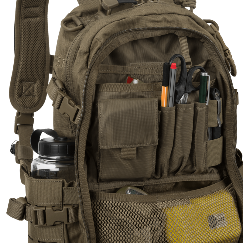 Compartimentul mai mic are un organizator intern pentru blocnotes, GPS, ustensile de scris și alte obiecte esențiale, plus un buzunar transparent de vinil pentru hărți și documente. În exterior există 3 buzunare plate și două pe laterale pot fi întinse pentru a se potrivi sticlelor de apă.