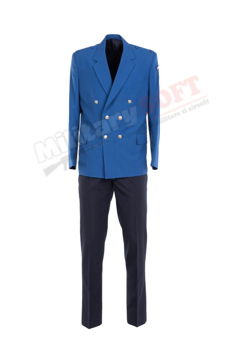 Vestonul este confectionat din stofa, de culoare bleu-jandarm.