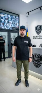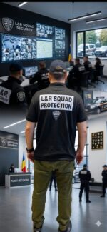 Personalizare Frontală: Pe partea stângă a pieptului se află un patch dreptunghiular alb cu text negru, pe care scrie clar „L&R SQUAD PROTECTION”. Această plasare permite identificarea rapidă a apartenenței agentului la structura de securitate.
