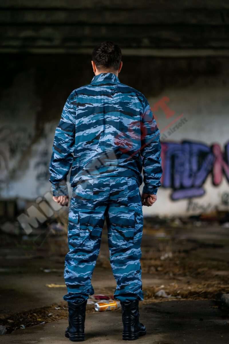 Bluza de la costum se confecționează din țesătură doc camuflaj . Se încheie în față cu fermoar care este acoperit de o fentă cu velcro.