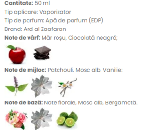 Parfumul Hareem Al Sultan se deschide cu o combinație profundă și plină de mere roșii dulci, ciocolată neagră, patchouli, mosc alb și vanilie delicioasă. Baza este dominată de arome florale și bergamotă.