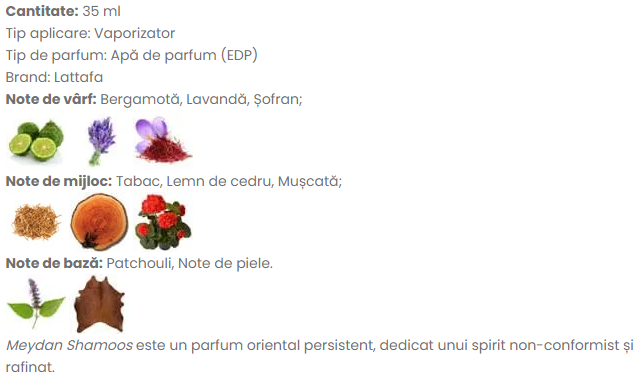 Meydan Shamoos este un parfum oriental persistent, dedicat unui spirit non-conformist și rafinat.
