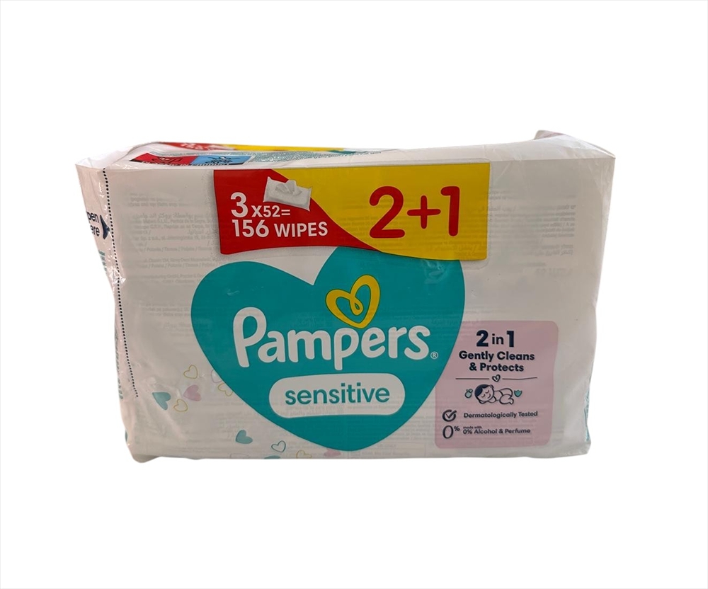 Servetele umede Pampers Sensitive 3x52bucati, 156 servetele. Curatare delicata pentru pielea sensibila a bebelusului. Formula pe baza de apa protejeaza pH-ului natural al pielii, contin 0% alcool. Sunt testate dermatologic, fabricat din fibre de plante.